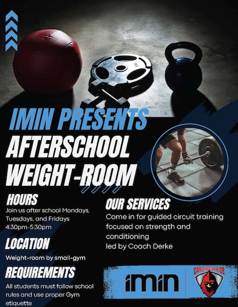 After school weight room program with IMIN Posted September 16, 2025 The hours are Monday, Tuesday, Friday from 4:30pm-5:30pm starting today, and will be led By Coach Derke. For more information students can come to room A-15 after school. Please see the attached flyer. Download PDF