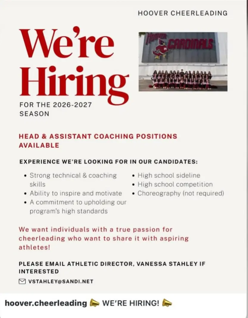 Hoover Cheer is looking for passionate, skilled, and driven individuals to join our coaching staff and continue to grow our program!