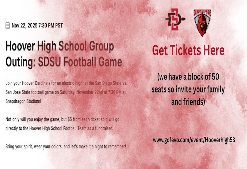 Join your Hoover Cardinals for an electric night at the San Diego State vs. San Jose State football game on Saturday, November 22nd at 7:30 PM at Snapdragon Stadium!